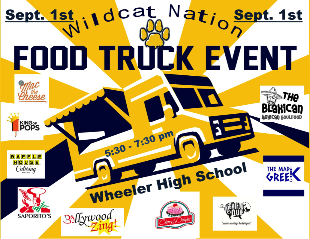 Our first Food Truck Night was a huge success, with #WILDCATNATION represented by students & their families from all Wheeler feeder schools and attendees from all over the East Cobb! #WILDCATNATION invites the community to kick off the Labor Day holiday weekend in Wheeler’s parking lot at 5:30PM, prior to the Wildcat’s game against the South Cobb Eagles. It’s Jr. Wildcat Night for the Wildcat Football Program and Food Truck Night will benefit the four local school organizations. The Food Trucks will be set up at 5:30 so you can get some great food and then stay for the game at 7:30!